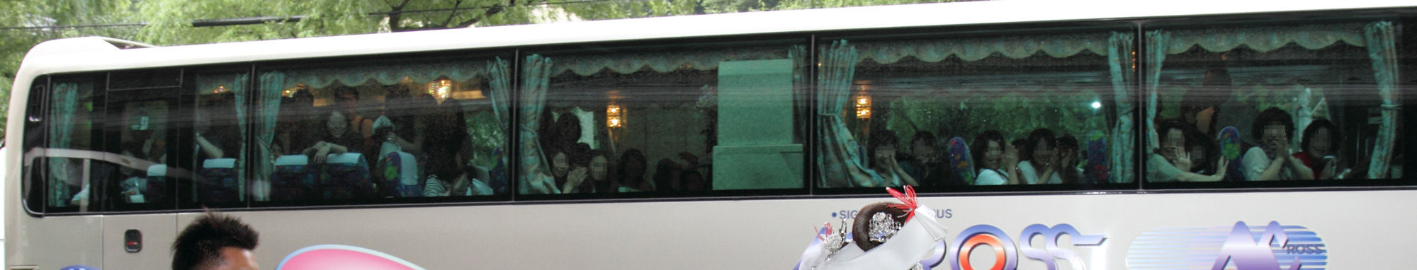 お嫁さんがバスに向かってお辞儀をすると、バスの窓から大喜びで手を振っている。