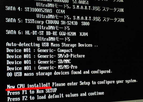 組み直して起動すると、「New CPU Installed!」って出てます。