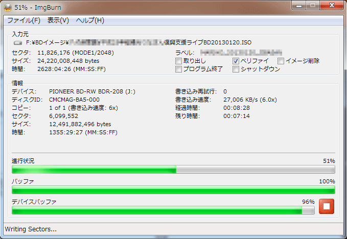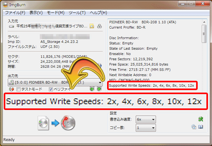 Verbatim製のBDメディアをセットし、ImgBurn起動。