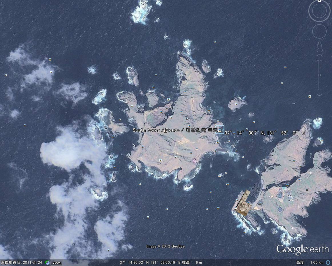 ふと思いついて、GoogleEarthで竹島を検索してみましたが、鹿児島県の下のほうの島に案内されてしまいました。島根県のはずなのに。Wikiで住所というか緯度経度を調べて、GoogleEarthで直接検索(37° 14′ 30″ N, 131° 52′ 0″ E)したところ、大変驚く結果となりました。